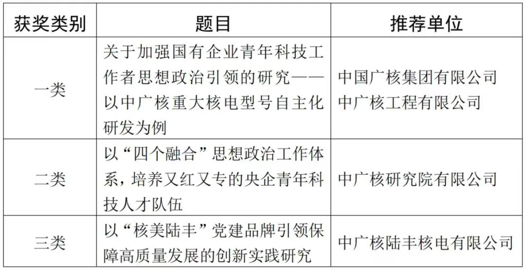 本次中國(guó)電力思想政治工作研究會(huì)共評(píng)選出優(yōu)秀研究成果100篇,包括30篇一類(lèi)優(yōu)秀研究成果,40篇二類(lèi)優(yōu)秀研究成果和30篇三類(lèi)優(yōu)秀研究成果。其中中廣核獲評(píng)一類(lèi)優(yōu)秀研究成果1篇、二類(lèi)優(yōu)秀研究成果1篇、三類(lèi)優(yōu)秀研究成果1篇。